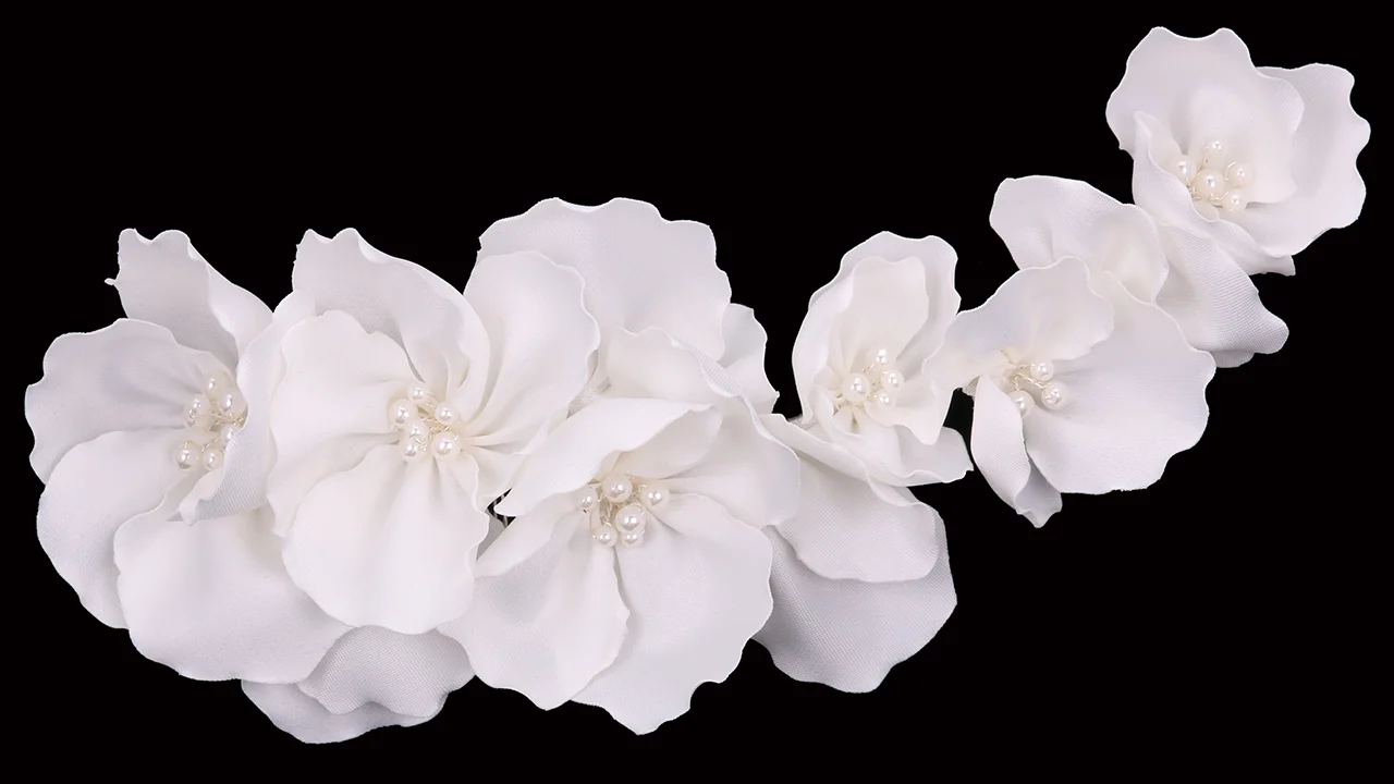 Rhodium plated hair comb with fabric flowers and pearl beads, 8″ L x 3.5″ W, Ivory/Silver.