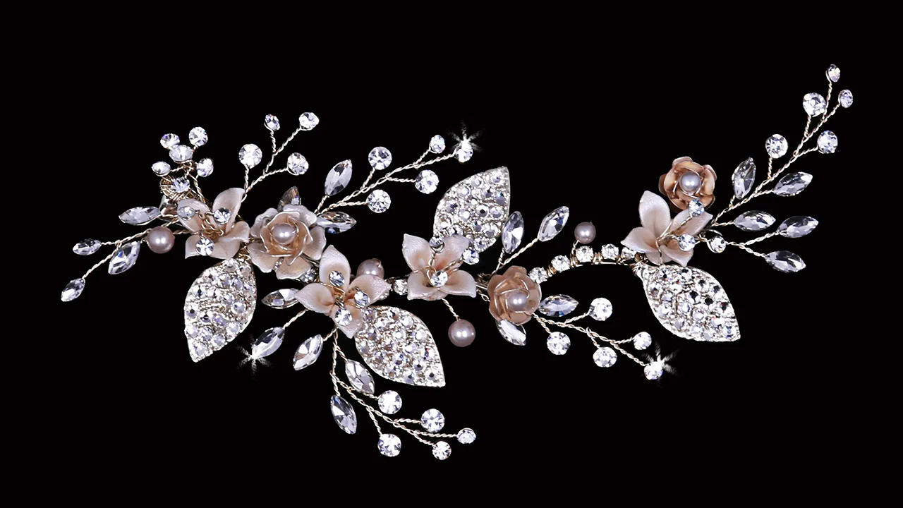 Rhodium plated hair comb with floral design, pearl beads and rhinestone accents, available colors Light Gold/Clear/Light & Pink/Rum Pink.