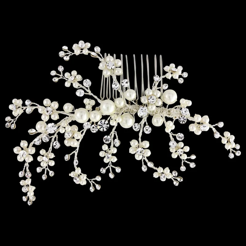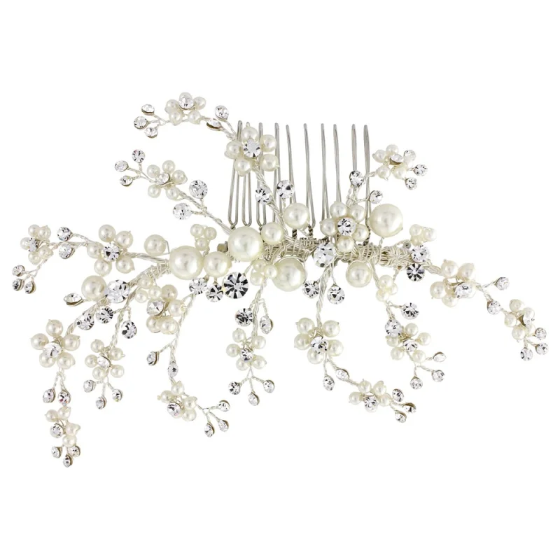 Betsy Luxurious pearl hair comb in a vintage inspired design – with simulated ivory pearls on a silver plated finish.